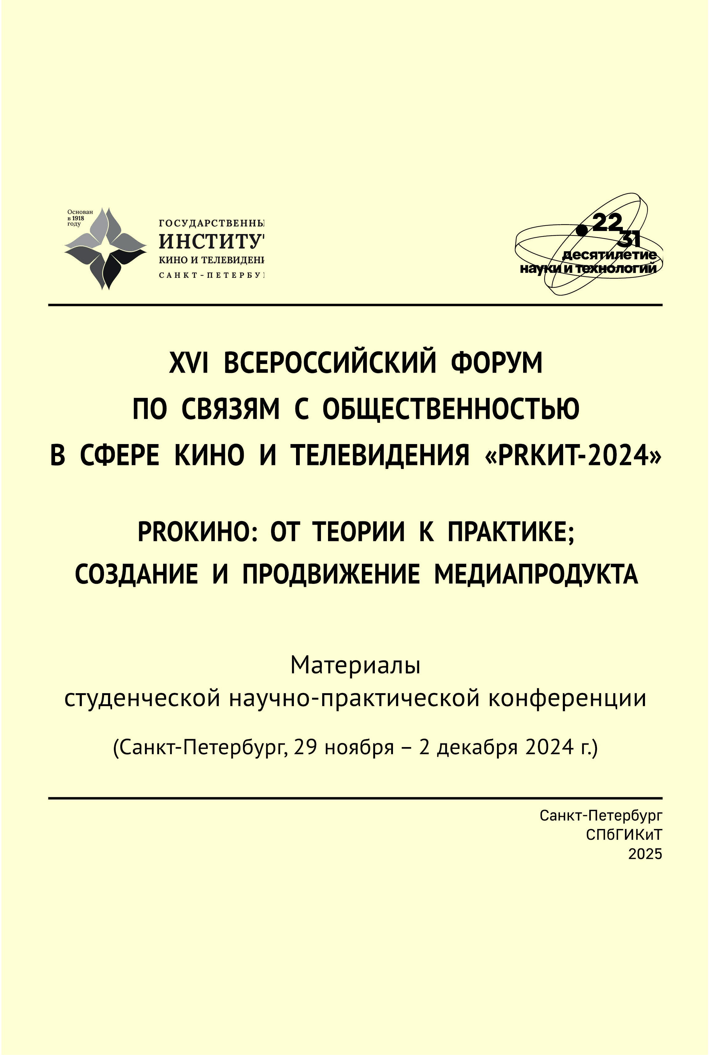 >> PROКИНО : от теории к практике; создание и продвижение медиапродукта : материалы студенческой научно-практической конференции (Санкт-Петербург, 29 ноября – 2 декабря 2024 г.) / XVI Всероссийский форум по связям с общественностью в сфере кино и телевидения «PRКИТ-2024» ; редкол.: Е. В. Сазонова (отв. ред) [и др.]. - Санкт-Петербург : СПбГИКиТ, 2025. - 288 с. - URL: . - Режим доступа: для автор. пользователей. - Электрон. версия печ. публикации. - ISBN 978-5-94760-627-0. - Текст : электронный.