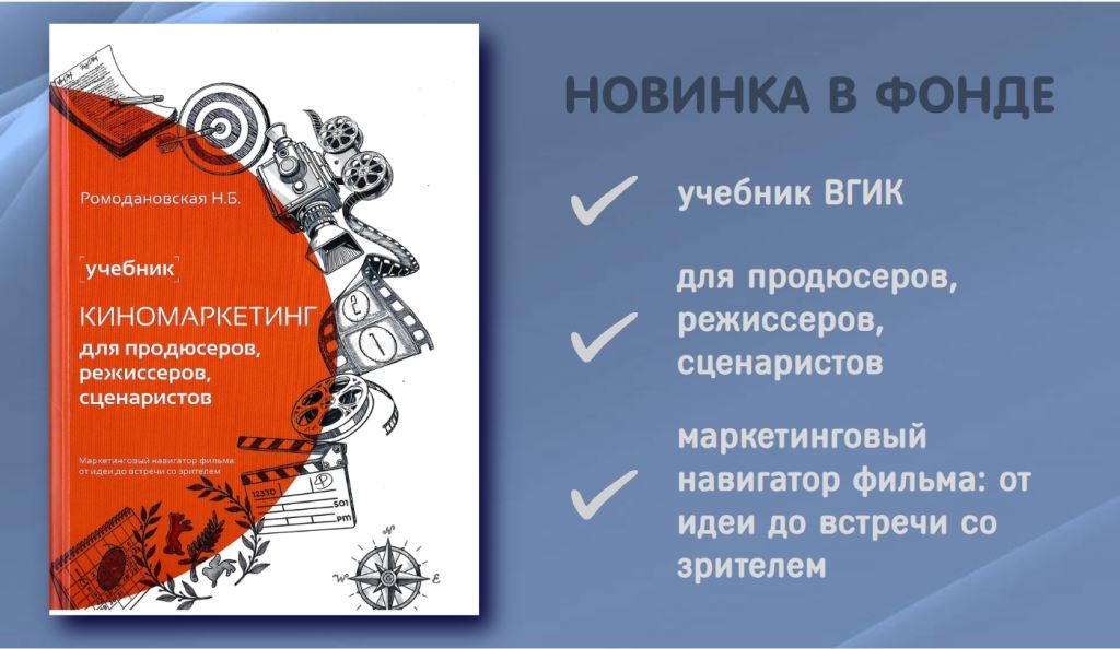Ромодановская, Н. Б. Киномаркетинг для продюсеров, режиссеров, сценаристов. Маркетинговый навигатор фильма: от идеи до встречи со зрителем : учебник / Н. Б. Ромодановская ; Всерос. гос. ун-т кинематографии им. С. А. Герасимова (ВГИК) ; Кафедра дистрибуции и маркетинга. - Москва : ПрофиСинема, 2025. - 576 с. - ISBN 978-5-4465-4538-4.